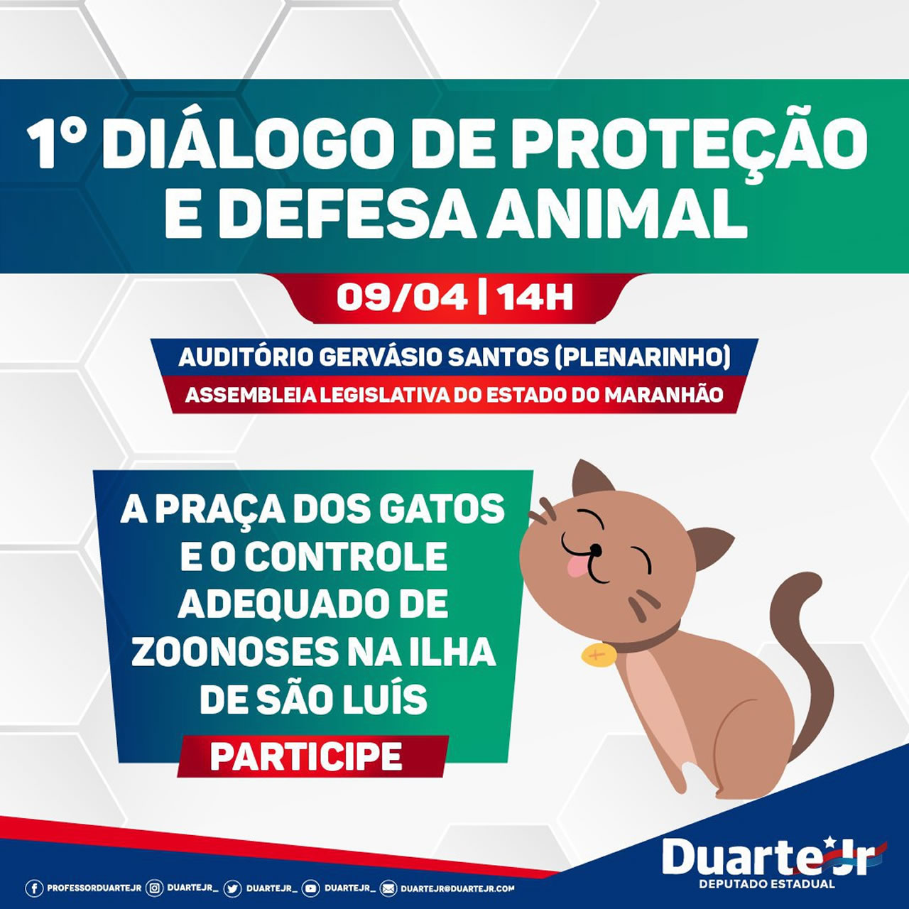 A Praça dos Gatos pode estar com os dias contados. Uma iniciativa do deputado Duarte Jr irá debater as ações mais adequadas para acabar com o abandono de animais e o devido controle de zoonoses no local que se tornou um verdadeiro problema de saúde pública em São Luís. Trata-se do 1° Diálogo de Proteção e Defesa Animal, que será realizada na próxima terça-feira, 9 de abril, às 14h, no Auditório Gervásio Santos, o Plenarinho da Assembleia Legislativa do Estado do Maranhão.