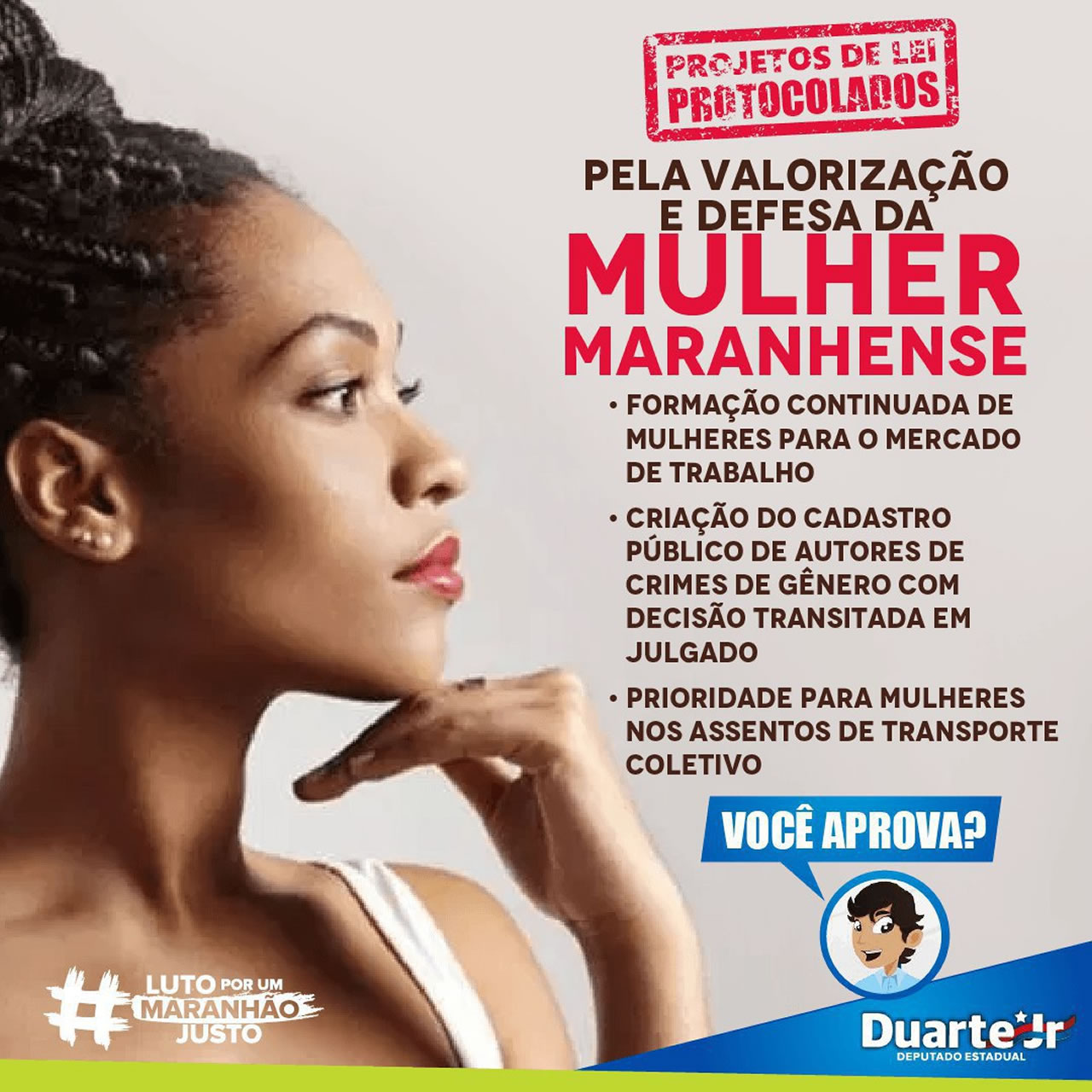 Duarte Jr. também protocolou pedido para que seja votado, em regime de urgência, projeto da deputada estadual Ana Mendonça que visa incluir no ensino médio, de forma interdisciplinar, o tema “Combate à Violência Contra a Mulher” nas escolas públicas e privadas de todo o Maranhão. “A deputada Ana Mendonça está de parabéns pela iniciativa porque este projeto tem uma importância estratégica para a mudança de mentalidade e de comportamento sobre as mulheres. As gerações que formarão o futuro devem aprender hoje e sempre a respeitar e cuidar das mulheres em qualquer situação”, conclui Duarte Jr.