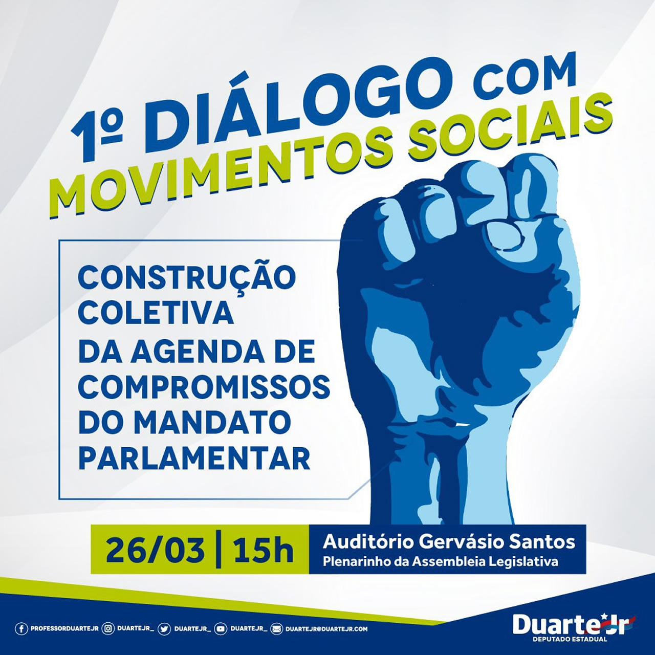 O deputado estadual Duarte Jr., presidente da Comissão Parlamentar de Direitos Humanos e das Minorias, irá realizar o 1º Diálogo com Movimentos Sociais, no próximo dia 26 de março, às 15h, no Auditório Gervásio Santos (Plenarinho), na Assembleia Legislativa do Estado do Maranhão